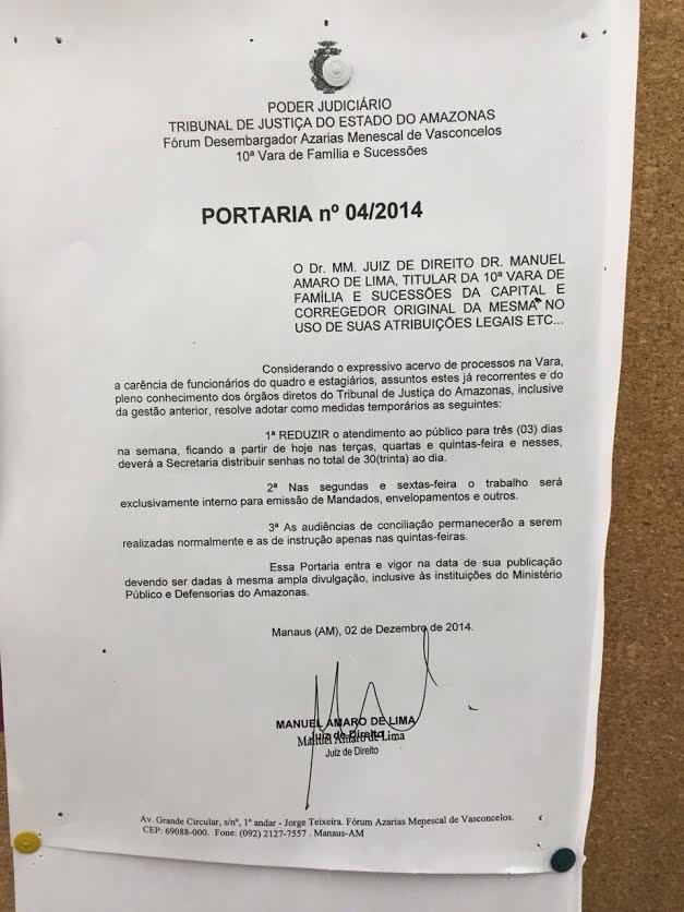 O juiz Manuel Amaro de Lima resolveu restringir o atendimento na 10ª Vara de Família e Sucessões do Fórum Desembargador Azarias Menescal, em Manaus. Ele mesmo baixou Portaria estabelecendo que nas segundas e sextas-feiras o trabalho será interno.