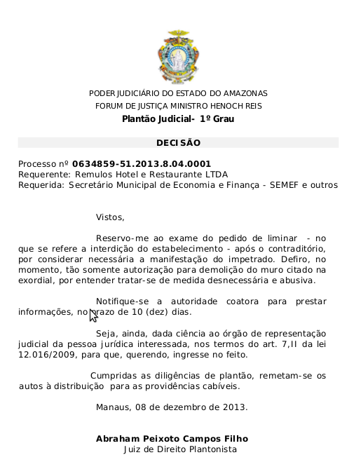 Em seu despacho, o magistrado diz que tratar-se de medida desnecessária e abusiva a construção do muro em frente a boate que foi interditada durante a “Operação Centro Seguro”, desencadeada na semana passada pela Prefeitura de Manaus, com apoio da Polícia Civil e vários órgãos estaduais e municipais.