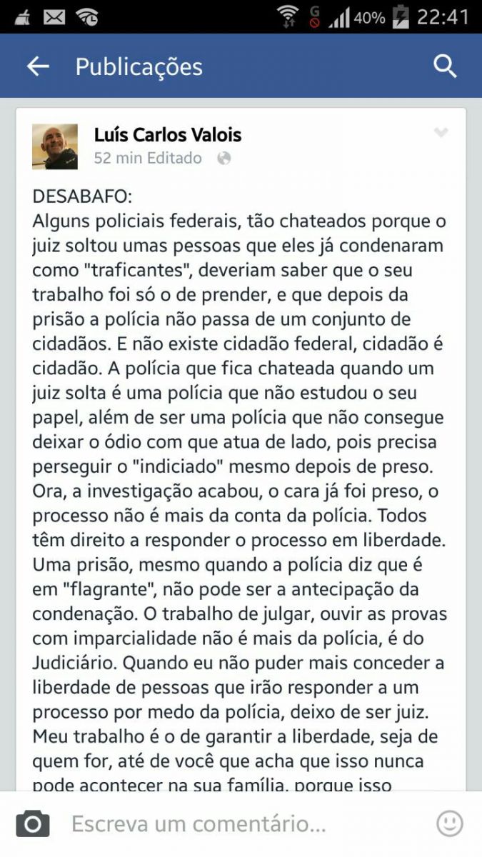O juiz Luis Carlos Valois reagiu às criticas pela soltura de três integrantes de uma quadrilha de traficantes de drogas presos pela Polícia Federal em dezembro com um carregamento de 110 quilos de cocaína, avaliado em mais de R$ 1 milhão. Na sua página no Facebook, o magistrado diz que todos tem o direito de responder o processo em liberdade e que mesmo a prisão em flagrante não é a antecipação da condenação. O magistrado acrescenta que a polícia quer que o juiz tenha medo dela e que no dia que ele tiver esse medo, deixa de ser juiz. Veja abaixo o desabafo: