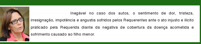Maria Eunice diz na sua decisão ser inegável o sentimento de dor, tristeza, irresignação, impotência e angustia sofridos pelos pais da criança ante o ato injusto e ilícito praticado pela Unimed, diante da negativa de cobertura da doença.