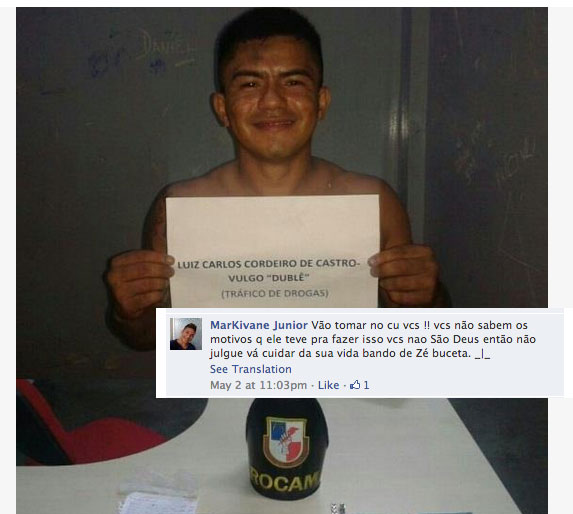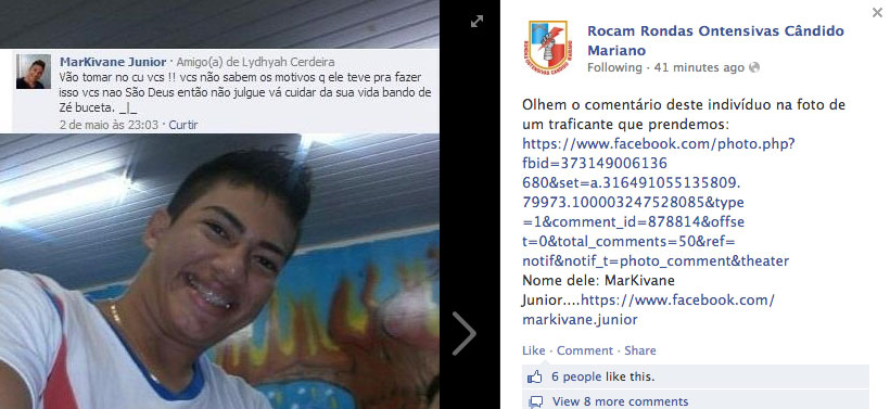 Irritou polciais da Ronda Candido Marioano (ROCAM) o comentário do leitor Markivane Junior, feito em uma postagem que exibia a prisão de um traficante. Os militares consideraram ofensivo o comentário e o relacionaram na página da instituição no Facebook. Veja abaixo: