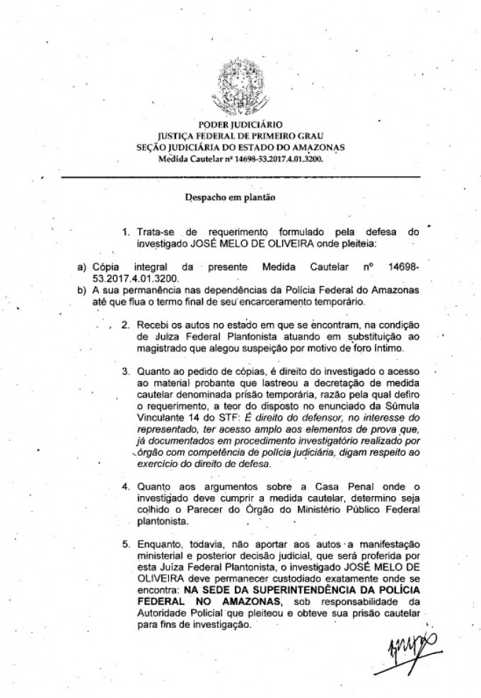 Manaus/AM - A Justiça Federal acaba de determinar que o ex-governador José Melo permaneça custodiado na sede da Polícia Federal e não vá para o presídio.