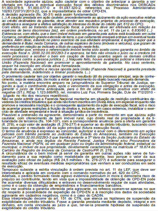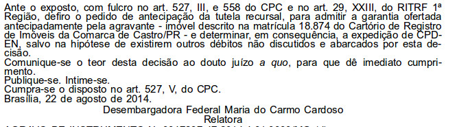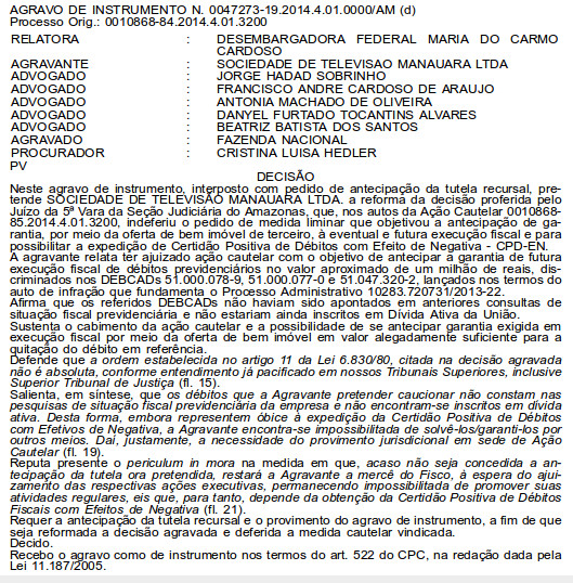 A desembargadora Federal Maria do Carmo Cardoso concedeu pedido de tutela recursal a Sociedade Televisão Manauara LTDA, permitindo que a empresa tenha acesso a certidão negativa de débitos, uma vez que apresentou bem imóvel como garantia, no valor de R$ 24,5 milhões , sufieciente, no entender da magistrada, "para assegurar o resultado eficaz de eventuais medidas expropriatórias que venham a ser conduzidas em sede de execução."