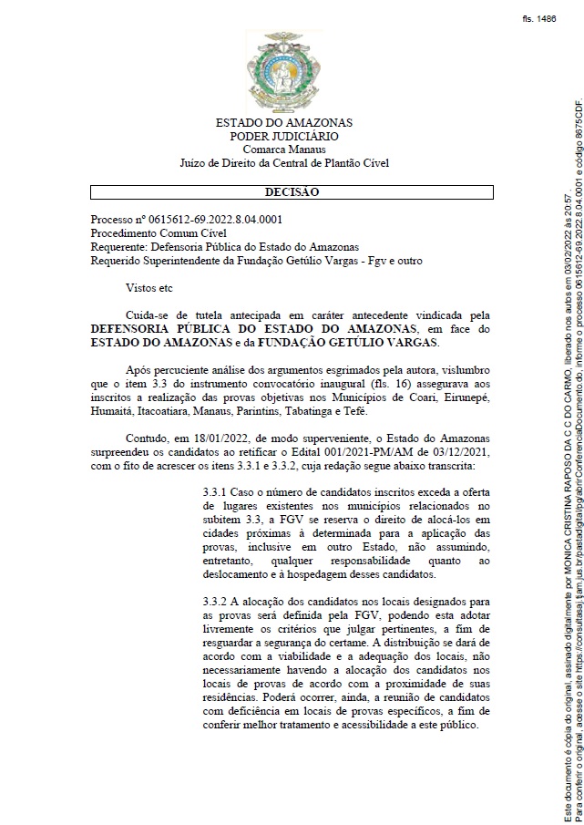 A decisão atende ao pedido da Defensoria Pública do Estado do Amazonas , “a fim de que o item 3.3 do edital inaugural seja devidamente cumprido, assegurando-se, pois, a cada candidato a realização das provas objetivas nos Municípios por que optaram: Coari, Eirunepé, Humaitá, Itacoatiara, Manaus, Parintins, Tabatinga e Tefé .”.