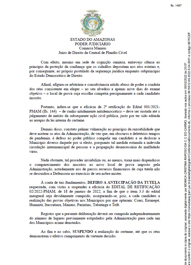 Na decisão, a juíza Mônica Cristina Raposo da Câmara Chaves do Carmo, do Juízo de Direito da Central de Plantão Cível, argumenta que houve “abuso de poder” do Governo do Amazonas e da Fundação Getúlio Vargas (FGV) em realocar o local da prova apenas 9 dias antes do certame, mesmo com edital inicial assegurando aos inscritos a realização das provas objetivas nos Municípios de Coari, Eirunepé, Humaitá, Itacoatiara, Manaus, Parintins, Tabatinga e Tefé.