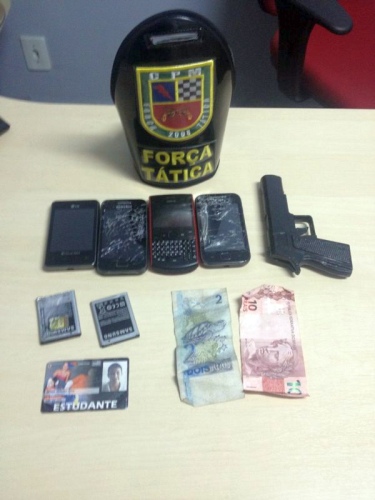 Produto dos roubos e a arma falsa usada pelos ladrões