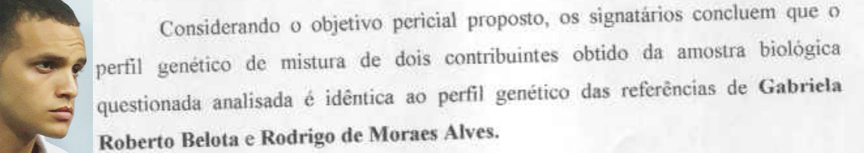 No exame de DNA assinado pelos peritos criminais Delson tavares de Freitas Junior e Daniela Koshikene, consta que no perfil genérico do material biológico encaminhado para análise estão presentes todos os alelos encontrados na referência da vítima Gabriela Roberto Belota, assim como todos os de Rodrigo de Moraes Alves, comprovando o estupro.