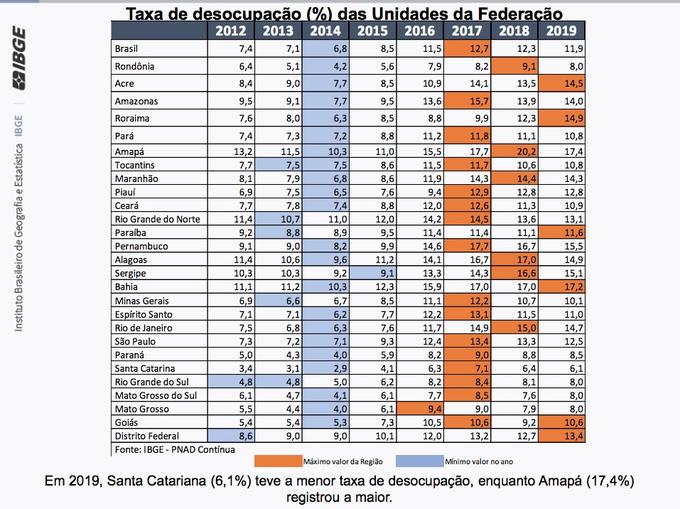 Manaus fechou o ano com a maior taxa de desocupação entre as capitais com 17,8%, a frente de Macapá que teve 17,3% e de São Luiz e Salvador, ambas obtiveram taxa de 16%. Entre os Estados, o Amazonas figura na 10º posição na taxa de desocupados, fechando com 14% no ano. O Amapá lidera a lista com 17,4%, seguido da Bahia com 17,2% e de Pernambuco com 15,5%.