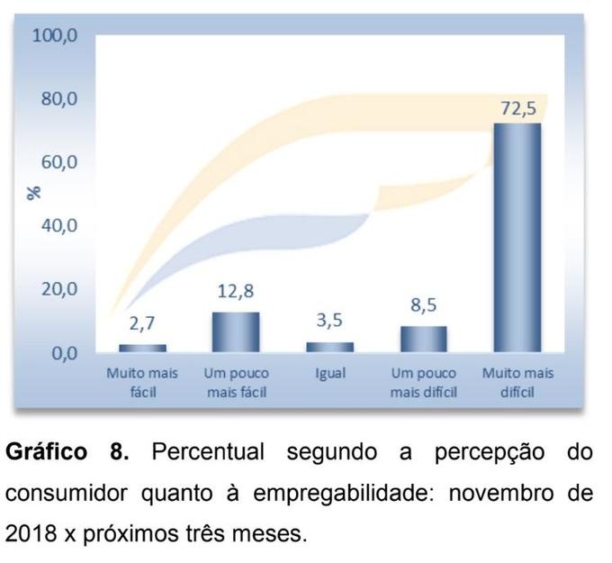 Quando indagados sobre as oportunidades de emprego para os próximos três meses, os consumidores continuam pessimistas, com 81% acreditando que as chances de arranjar um novo emprego estará um pouco ou muito mais difícil quando comparadas em relação a situação atual. Na opinião de 15,5% a situação estará um pouco ou muito mais fácil, sendo que 3,5% consideram que permanecerá inalterado.