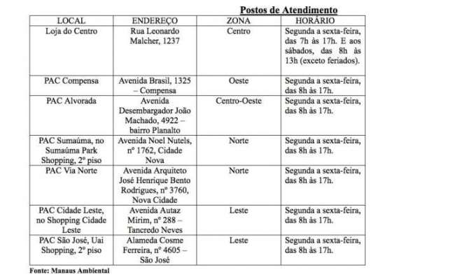 A negociação pode ser feita diretamente com a Central de Atendimento da empresa, por meio do número 0800 092 0195 (capital) ou (92) 3627-8360 (outras localidades); pelo e-mail [email protected], ou ainda nos postos de atendimento da concessionária.