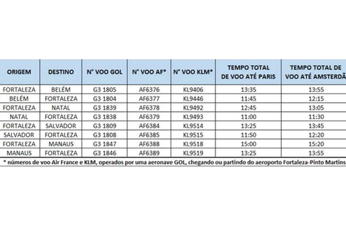Os trechos domésticos nos estados brasileiros até a capital cearense serão operados pela Gol. Já para os internacionais, a Air France opera o voo de ida enquanto a KLM fica responsável pela volta a Fortaleza.
