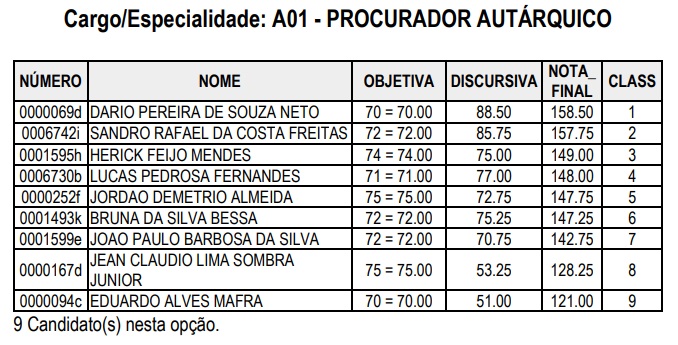 Manaus/AM - A Manaus Previdência, divulgou o resultado final do concurso para o cargo de Procurador Autárquico, organizado pela Fundação Carlos Chagas (FCC). A classificação final é composta por nove candidatos no total . O edital foi publicado no caderno 1, da edição n° 5.364, do Diário Oficial do Município (DOM) da última terça-feira, 14. O edital apresenta uma vaga para o cargo, ou seja, para o primeiro colocado da lista, além de cadastro reserva se houver vacância no setor durante a validade do concurso.