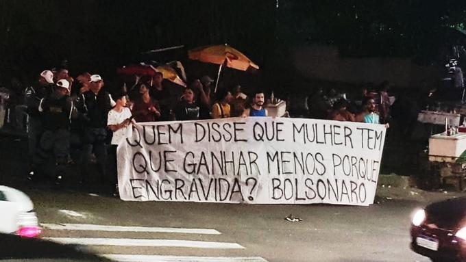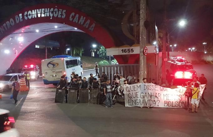 Com cartazes de "Bolsonaro não é bem-vindo em Manaus" e "Igreja não é curral eleitoral", o grupo fez vigília para a entrada de Bolsonaro no local. Por volta de 19h, o presidente já entrou no local.