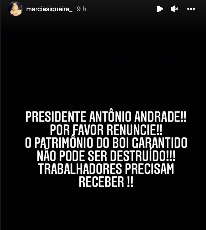 “Presidente Antônio Andrade! Por favor, renuncie! O patrimônio do Boi Garantido não pode ser destruído. Trabalhadores precisam receber!!”, escreveu a cantora.