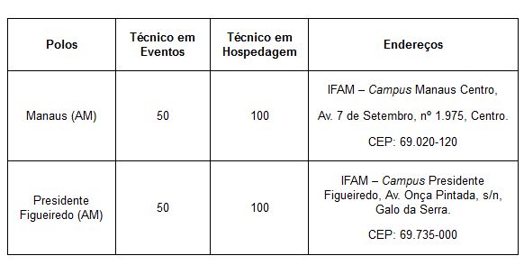 São disponibilizadas 300 vagas distribuídas nos Polos de Apoio Presencial que integram o Programa Escola Técnica Aberta do Brasil (Rede e-Tec Brasil), existentes em Manaus e Presidente Figueiredo.