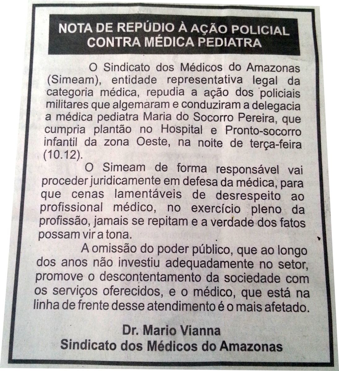 Em resposta, o Sindicato dos Médicos do Amazonas e Instituto de Cirurgia do Estado do Amazonas fizeram circular em jornal impresso neste domingo (15) suas posições.