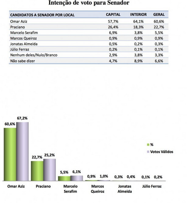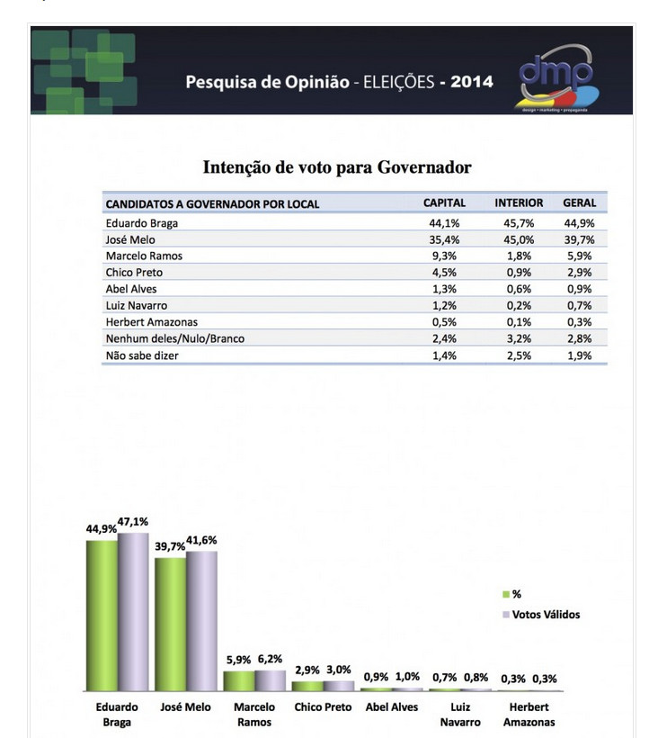 Pesquisa DMP/Rede Tiradentes, realizada entre os dias 21 e 28 de setembro com 2011 eleitores, em Manaus e no interior do Estado. aponta um crescimento do governador José Melo e a possibilidade de segundo turno nas eleições para governador do Amazonas.