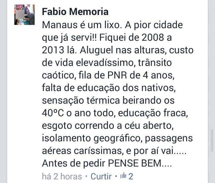 Militar que serviu no Amazonas faz recomendação no Facebook: "Manaus é um lixo"