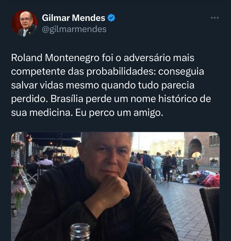 “Roland Montenegro foi o adversário mais competente das probabilidades: conseguia salvar vidas mesmo quando tudo parecia perdido. Brasília perde um nome histórico de sua medicina. Eu perco um amigo”, escreveu o ministro em uma rede social.