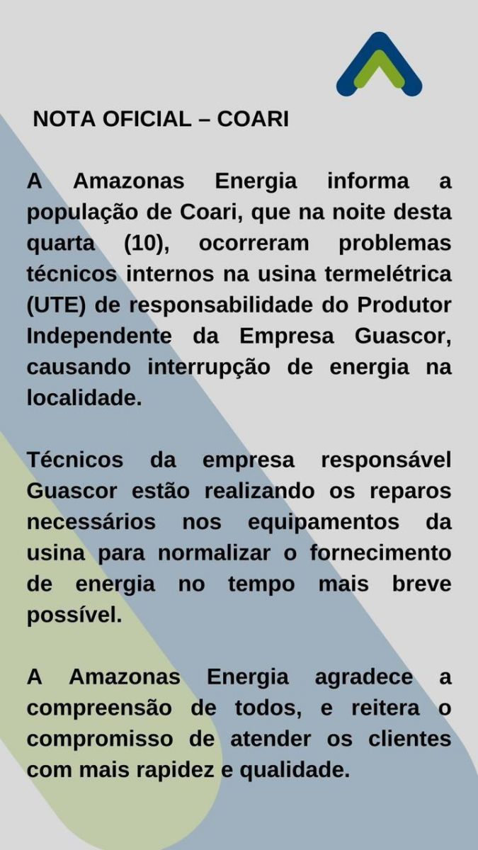 Segundo a Amazonas Energia, o problema foi causado por conta de problemas internos na usina termelétrica (UTE), que é de responsabilidade da empresa Guascor.