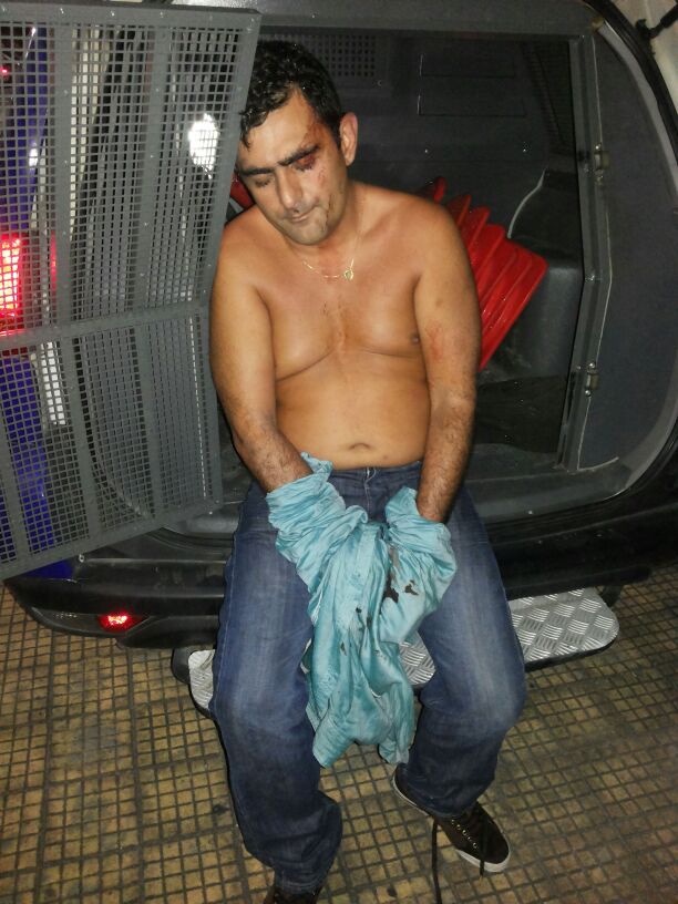 Ao ser algemado ele começou a se bater, no intuito de ferir a cabeça para acusar os agentes que impediram a ação do infrator que estava claramente bêbado.