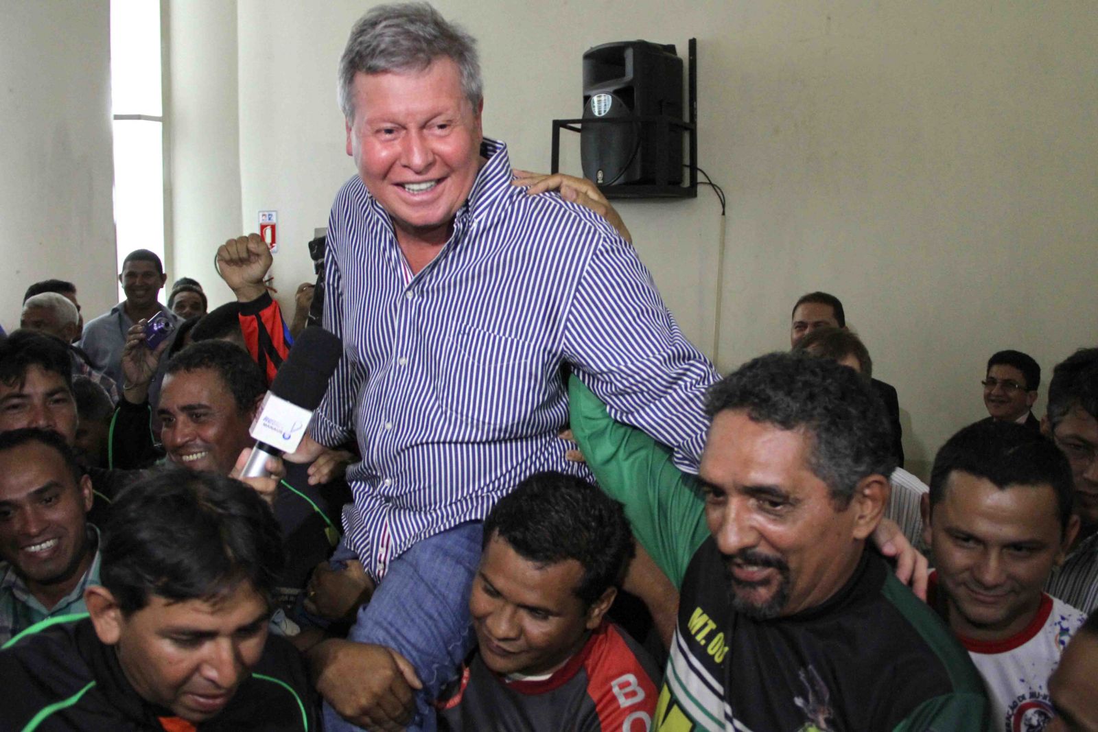 Os mototaxistas saíram da CMM, fazendo buzinaço, até chegarem à Prefeitura para agradecer o apoio do prefeito, que foi carregado pelos trabalhadores.