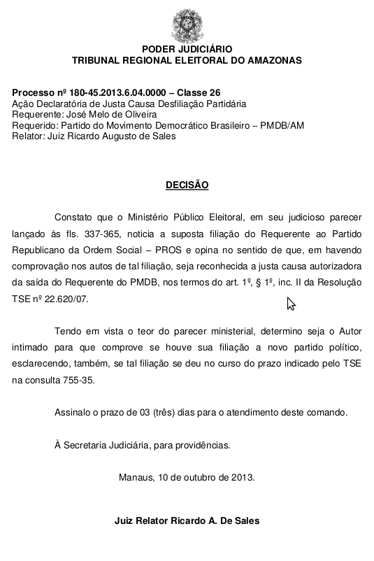 O vice-governador do Amazonas, José Melo, que anunciou no início deste mês a sua filiação ao Partido Republicano da Ordem Social (PROS), assumindo a presidência regional da legenda, já tem parecer favorável do Ministério Público Eleitoral pelo reconhecimento de justa causa de sua saída do partido. Assim, o vice-governador poderia ter ingressado em qualquer outra legenda e não em uma nova, para se livrar da acusação de infidelidade partidária.