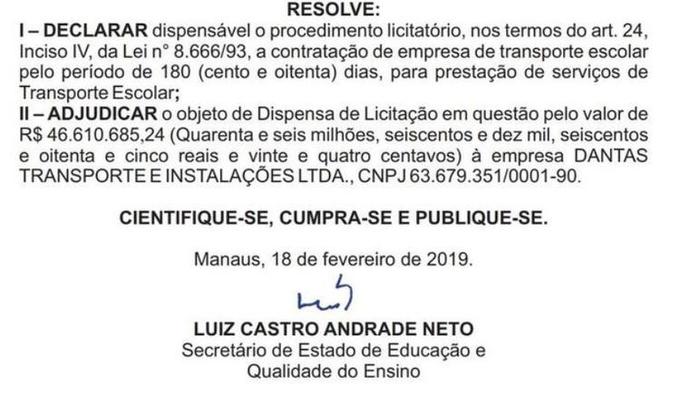 Manaus/AM - O Ministério Público do Estado do Amazonas (MP-AM) abriu investigação para apurar eventuais irregularidades na dispensa de licitação realizada pela Secretaria de Educação do Amazonas (Seduc) no valor de R$ 46,6 milhões. A dispensa foi assinada pelo secretário Luiz Castro com a empresa Dantas Transportes e Instalações Ltda., para prestar os serviços de transporte escolar, tendo como justificativa a necessidade emergencial.