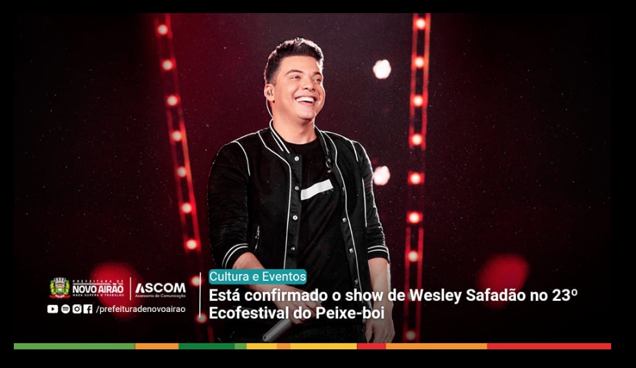 Manaus/AM - Um show de Wesley Safadão em Novo Airão está sendo alvo de Ação Cautelar do Ministério Público do Amazonas (MPAM), para que a prefeitura suspenda os pagamentos do contrato assinado com o cantor no valor total de R$ 700 mil. O artista deve se apresentar na 23ª edição do Eco Festival do Peixe-Boi, previsto para acontecer nesta semana, entre os dias 14 e 16 de outubro.