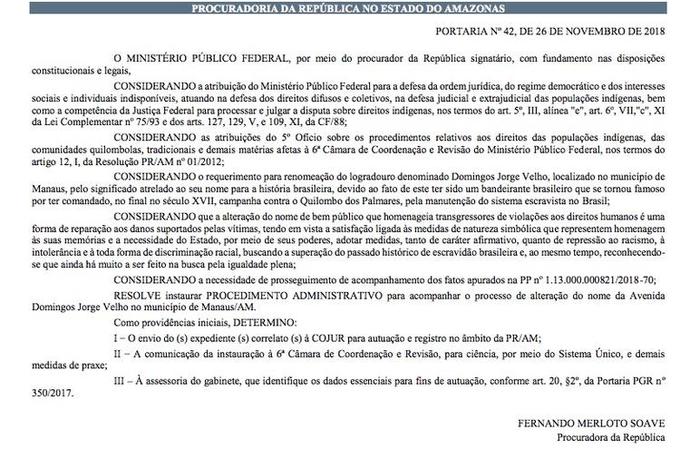 Manaus/AM - O Ministério Público Federal no Amazonas (MPF/AM) apura a mudança de nome da avenida Domingos Jorge Velho, localizada no bairro Dom Pedro II, zona centro-oeste de Manaus. O procurador da República Fernando Merloto Soave determinou a instauração de Procedimento Administrativa para a mudança, pois Domingos Jorge Velho ficou conhecido como um apoiador do sistema escravista do Brasil.