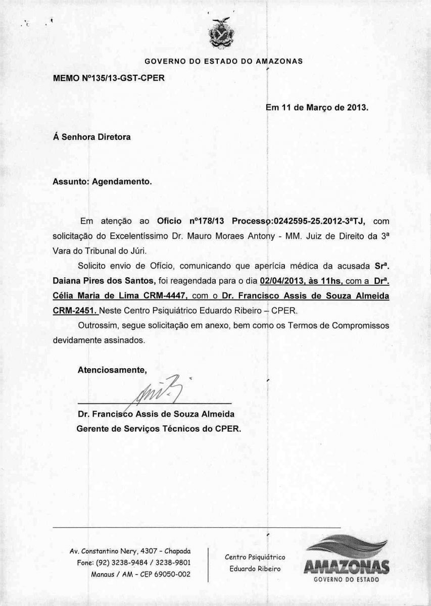 Os médicos Célia Maria de Lima e Francisco Assis de Souza Almeira, serão os respponsáveis em avaliar Daiana. O exame de sanidade mental foi solicitado pelo advogad de defesa da doméstica Francisco Boary.