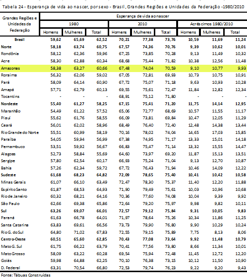 A região Nordeste, que tinha a esperança de vida ao nascer mais baixa em 1980 (58,25 anos) teve, em 30 anos, um incremento de 12,95 anos nesse indicador, chegando, em 2010, a 71,20 anos, ligeiramente acima da região Norte, que anteriormente estava à sua frente (de 60,75 para 70,76 anos). Essa inversão se deveu principalmente ao aumento de 14,14 anos na esperança de vida das mulheres nordestinas, que foi de 61,27 anos para 75,41, enquanto que a das mulheres da região Norte aumentou 10,62 anos, de 63,74 para 74,36 anos.