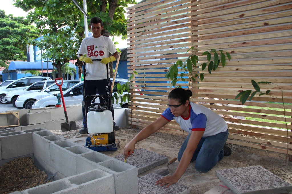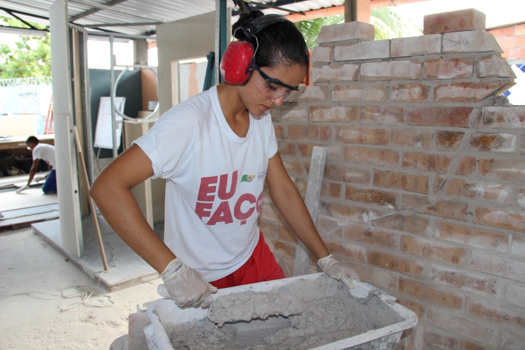 Os treinamentos de construções de alvenaria e de jardinagem e paisagismo são realizados na Escola SENAI Demóstenes Travessa, unidade voltada à formação de trabalhadores para a indústria da construção civil. As duas alunas são treinadas por outras duas mulheres, as instrutoras Sônia Rocha e Antônia Souza.