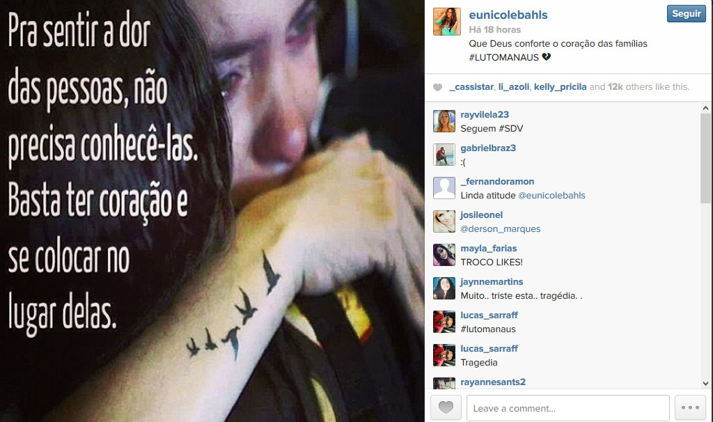 Na postagem, com a frase "Pra sentir a dor das pessoas, não precisa conhecê-las. Basta ter coração e se colocar no lugar delas", Nicole completa: "Que Deus conforte o coração das famílias #LUTOMANAUS".