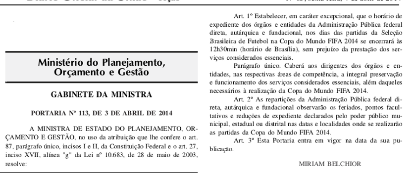 Durante os jogos da seleção brasileira na Copa do Mundo no mês de junho, o funcionalismo público federal terá o expediente encerrado as 12:30m. A medida, que deve ser seguida pelos governos estaduais, foi publicada no Diário Oficial da União que circulou nesta sexta-feira.