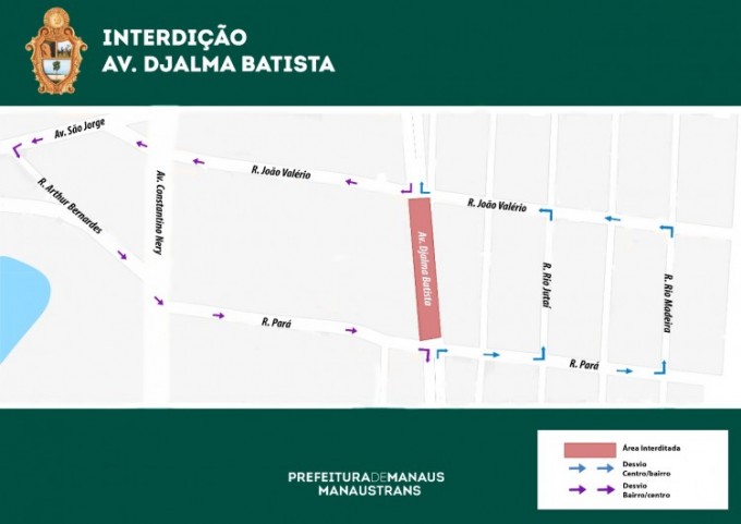 A partir das 9h da sexta-feira, (9), a avenida Djalma Batista, zona Centro-Sul, será interditada no trecho entre as ruas Pará e João Valério, nos dois sentidos de tráfego, para a execução dos trabalhos de recuperação da rede de drenagem profunda da área. Os condutores que seguem pela Djalma Batista poderão desviar do trecho interditado fazendo os seguintes desvios: