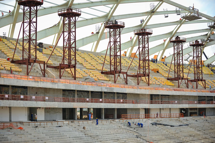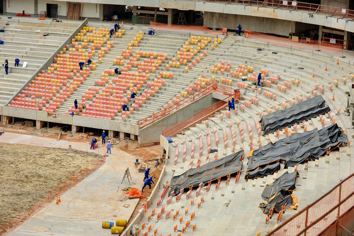 Os trabalhos avançam também na instalação dos vidros e as paredes internas dos camarotes, que já começaram a receber os forros. Os aparelhos de ar condicionado já estão sendo instaladas nos camarotes e os elevadores devem começar a ser colocados também esta semana. Mais de 14 mil assentos foram instalados nas arquibancadas superiores e inferiores.