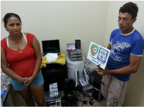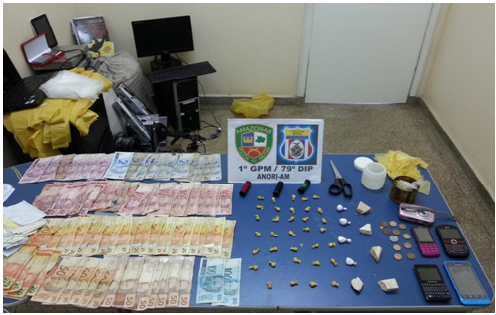 Na residência de “Thuca” e Michele, os policiais encontraram cinco pedras grandes e 34 trouxinhas de substância entorpecente com características de pasta base de cocaína, quatro trouxinhas com aspecto de cocaína em pó, R$ 2 mil em espécie e vários eletroeletrônicos sem nota fiscal, oriundos do tráfico de drogas, segundo as investigações.