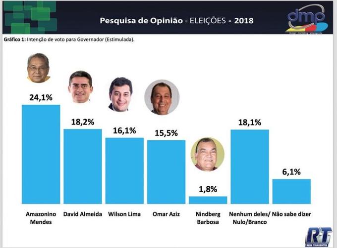 De acordo com a pesquisa da DMP/Tiradentes, que foi registrada no Tribunal Regional Eleitoral do Amazonas, foram entrevistados 1.533 eleitores, entre os dias 23 a 30 de julho.