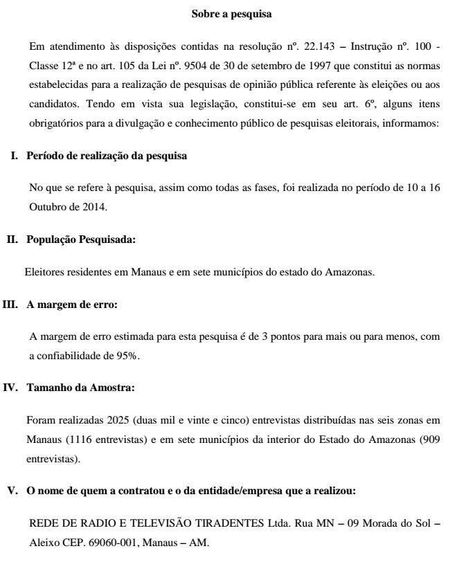 Nova rodada de Pesquisa DMP- Rede Tiradentes mostra um distanciamento do governador Josẽ Melo, candidato a reeleição, do adversário Eduardo Braga. A diferença entre os dos, que era de doze pontos na primeira pesquisa do segundo turno, agora subiu para 18 pontos. Foram entrevistados 2025 eleitores, entre 10 e 16 de outubro, em Manaus e mais sete municipios do interior do Estado, com margem de erro de 3%. A pesquisa está registrada no TRE sob o nũmero AM- 00058;2014