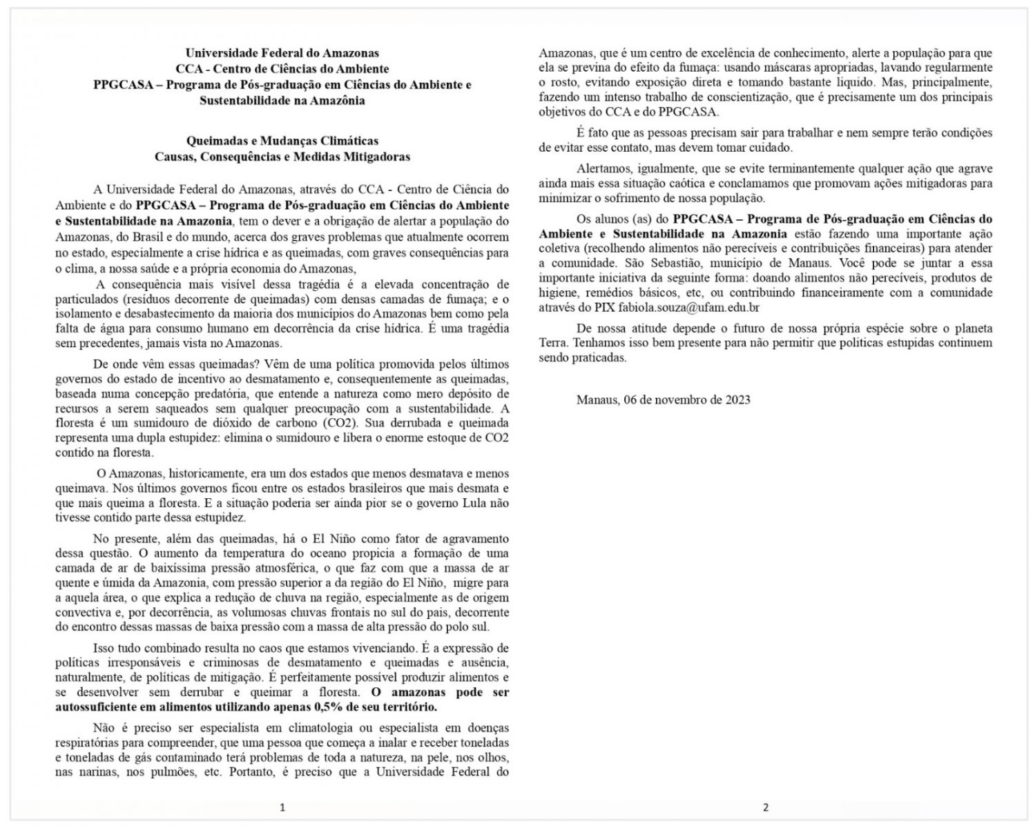 Interessados em colaborar com a campanha podem entregar alimentos e itens de higiene pessoal no Centro de Ciências do Ambiente, setor Sul do Campus Universitário Arthur Virgílio Filho ou enviar Pix para fabí[email protected].