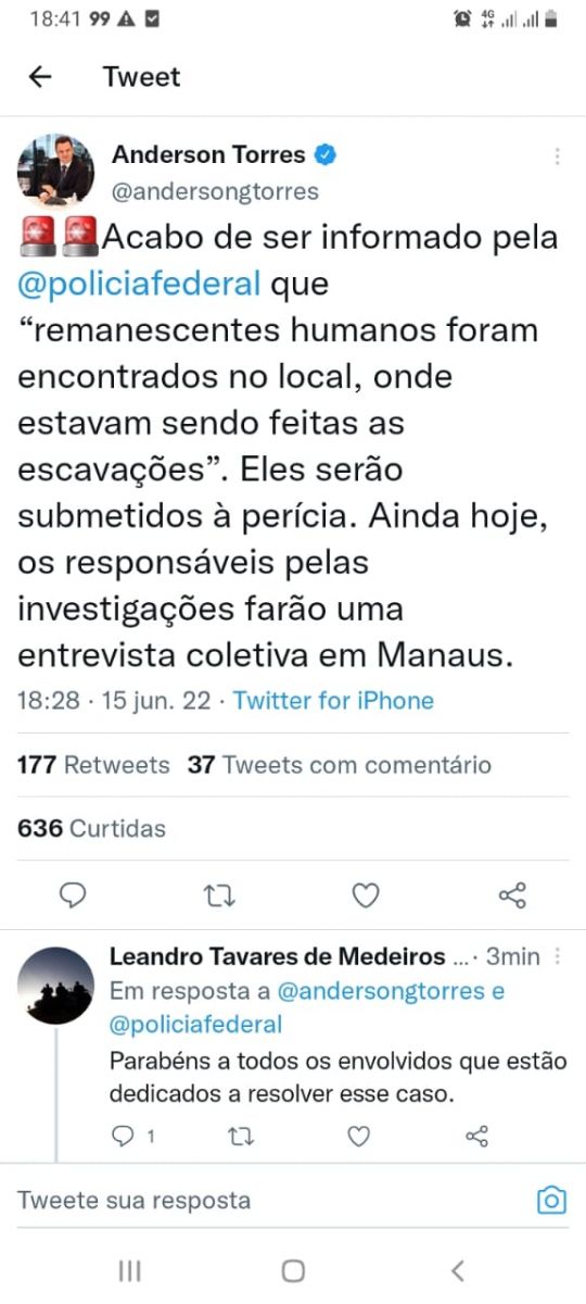Manaus/AM - O Ministro da Justiça Anderson Torres confirmou nesta quarta-feira (15), que a Polícia Federal encontrou 'remanescentes humanos' nas buscas em Atalaia do Norte, no Amazonas, onde houve o desaparecimento do jornalista inglês Dom Phillips e do indigenista brasileiro Bruno Araújo Pereira.