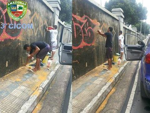 Na segunda-feira, 16, uma dupla de suspeitos foi abordada na avenida Rodrigo Otávio, por equipe do Ronda no Bairro sob o comando do aspirante I. Rodrigues e cabo Amanda, da 3ª Companhia Interativa Comunitária (Cicom). Os policiais militares encontraram com os elementos material para pichação. A dupla foi obrigada a limpar o muro da praça do Japiim, onde foram acusados de realizar o ato infracional.