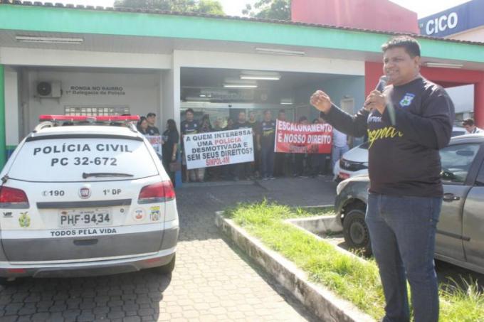 Manaus/Am - Um grupo de Policiais Civis do Estado se reuniram em frente ao 1ºDistrito Integrado de Polícia (DIP), no bairro Praça 14, Zona Sul, na manhã desta sexta-feira (6), para cobrar das autoridade o pagamento dos benefícios concedidos à categoria, o chamado escalonamento. De acordo o vice-presidente do Sindicato dos Funcionários da Polícia Civil no Amazonas (Sinpol-AM), Odirlei Araujo, apenas casos de flagrantes serão atendidos ao longo do dia.