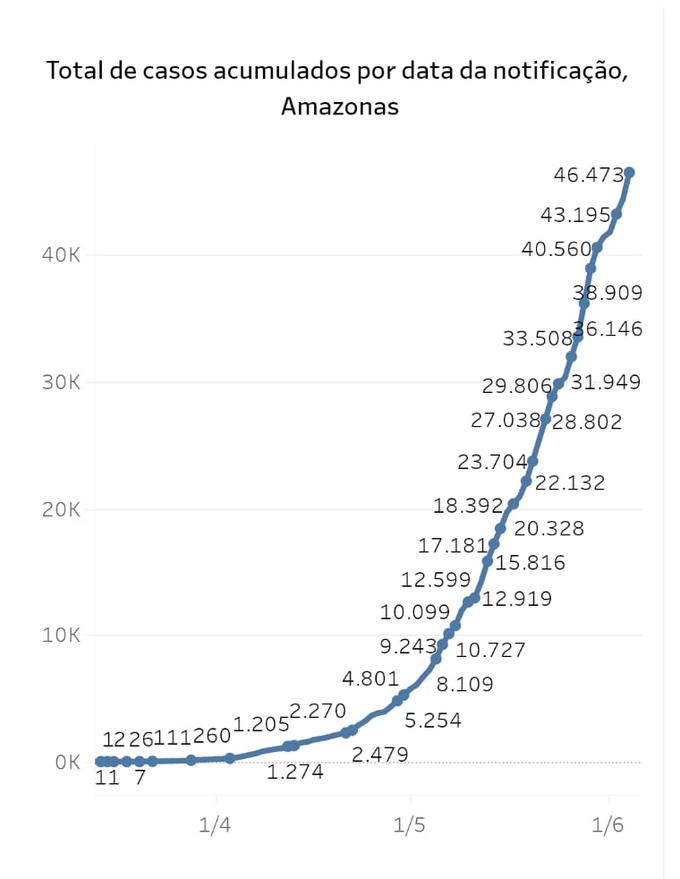 Outro gráfico mostra a curva dos casos notificados no Amazonas desde março até esta primeira semana do mês de junho.