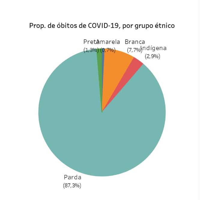 Em relação aos casos confirmados, 74% são pardos, 9,5% amarelos, 8,6% brancos, 6,5% indígenas e 1,4% pretos.