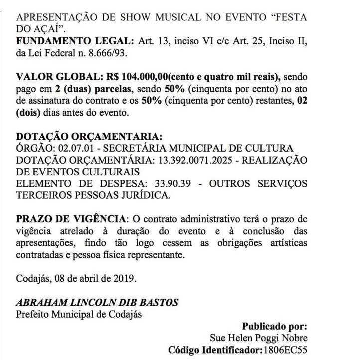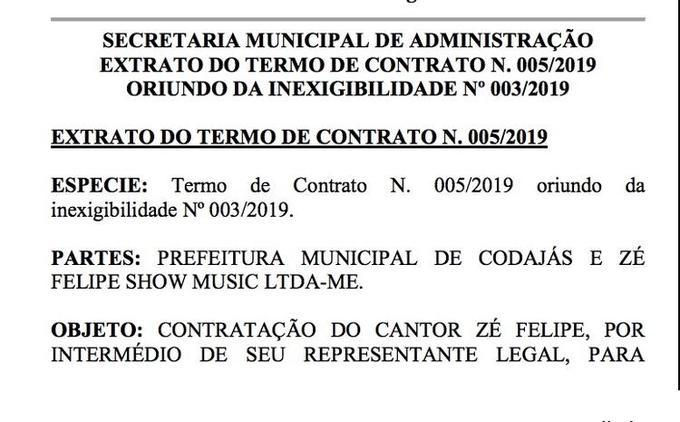 Confira abaixo o contrato assinado pelo prefeito de Codajás, Abraham Dib Bastos e a empresa Zé Felipe Show Music Ltda-ME.