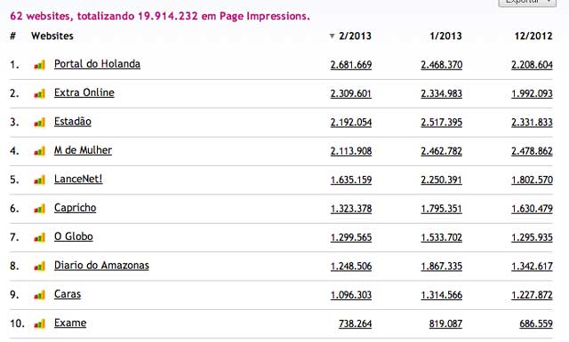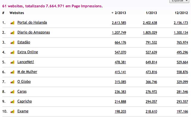 Cerca de 700 mil leitores do Portal do Holanda movimentaram em fevereiro 4,06 milhões de páginas, segundo dados do IVC, Instituto Verificador de Circulação. O site também mantém o primero lugar em visualizações de páginas em Manaus, no Amazonas e na região Norte do país.