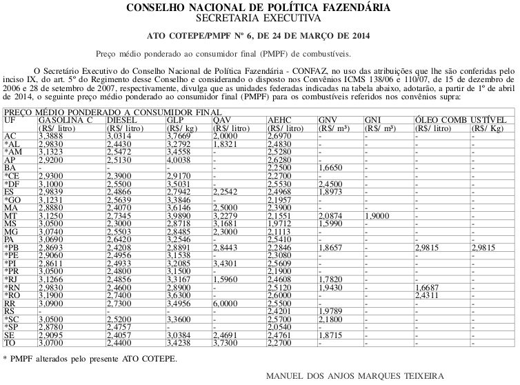 O Secretário Executivo do Conselho Nacional de Política Fazendária - CONFAZ, Manuel dos Anjos Marques Teixeira, divugou os novos preços da gasolina, diesel e gás de cozinha que poderão ser praticados em treze estados. Veja a tabela publicada no Diário Oficial da União nesta terça-feira.