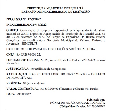 Manaus/AM - O prefeito de Humaitá, Dedei Lobo, publicou contrato de R$ 380 mil fechado com a empresa Mundo Paralelo Produções Artísticas Ltda, para realização de show da dupla Matheus e Kauan na 13ª Exposição Agropecuária, no dia 23 de setembro. O contrato firmado por inexigibilidade de licitação foi publicado no Diário Oficial dos Municípios, nesta terça-feira (30).